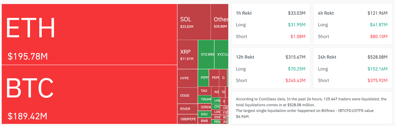 По данным Coinglass, за последние 24 часа ликвидации шортов по биткоину ($160,4 млн) сформировали 81,9% суммарного показателя вместе с ликвидациями лонгов.
