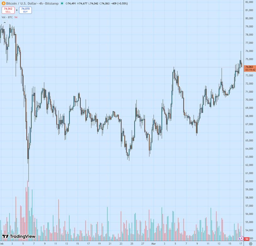 16 марта быки в биткоине ($BTC) приступили к штурму месячного максимума ($74 000), который на этот раз (третья попытка) оказался успешным.