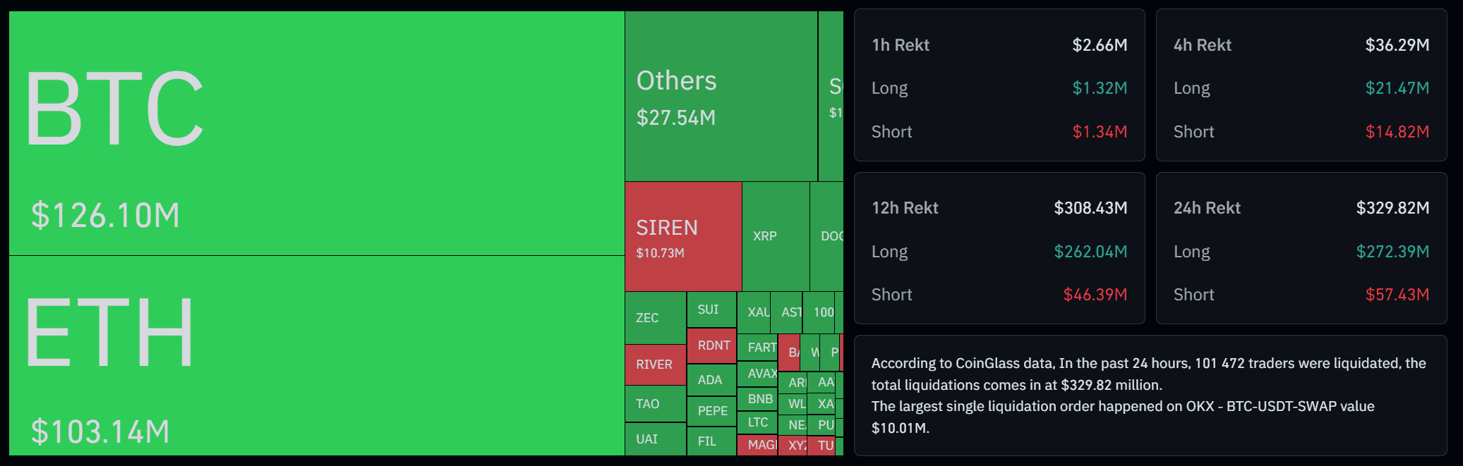 В сегменте биткоина ликвидации составили около $126 млн, в Ethereum — $103 млн. Крупнейшая единичная ликвидация произошла на бирже OKX и достигла $10 млн.