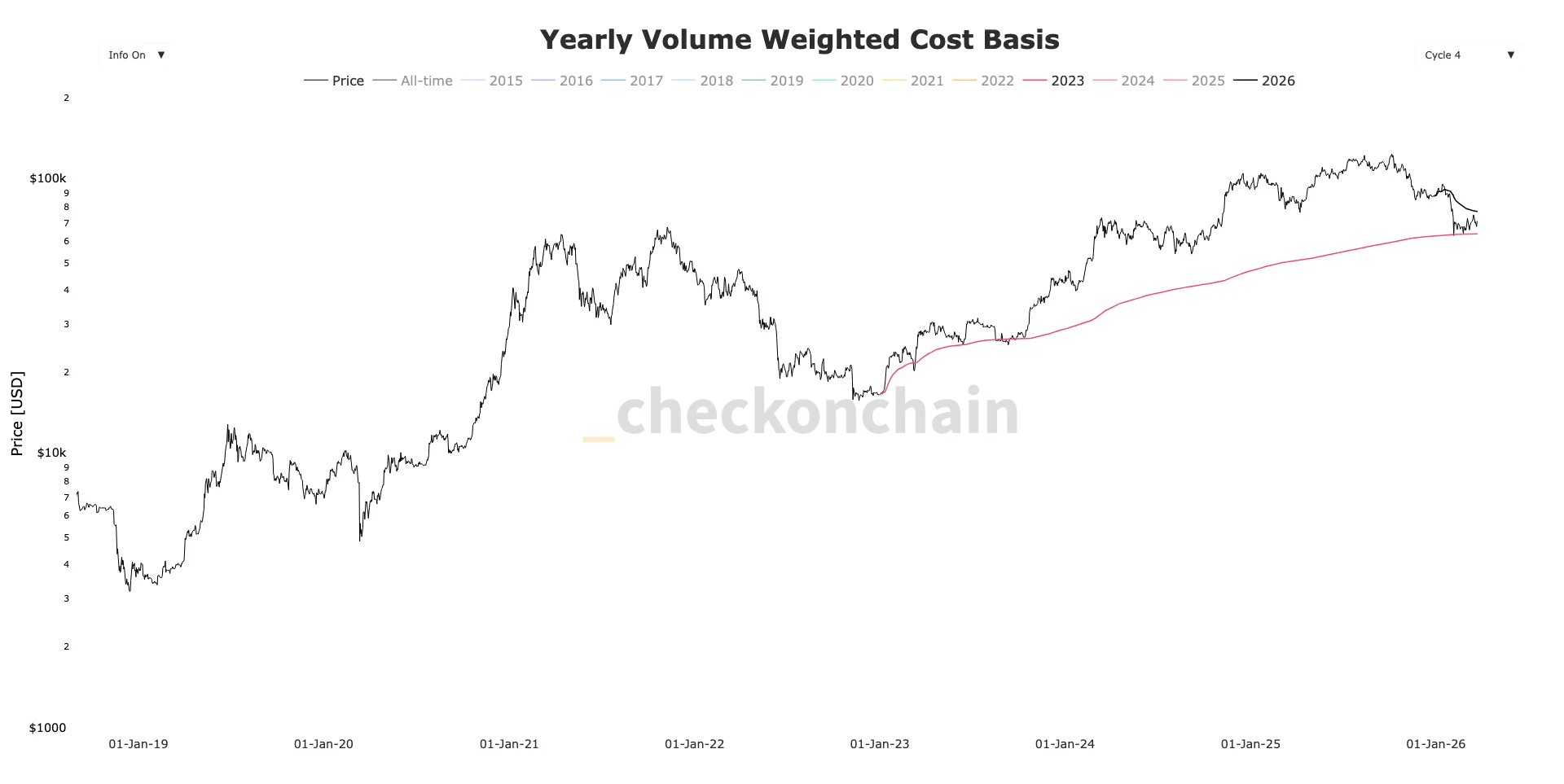 Средняя себестоимость инвестиций 2023 года (реализованная цена) сейчас составляет около $63 700. В начале февраля, во время локального дна, биткоин упал примерно на 50% от октябрьского исторического максимума — до уровня около $60 000. Рыночная цена протестировала эту отметку и удержалась над ней, подтвердив ее роль поддержки.