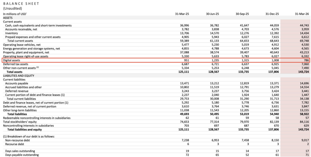 Tesla также зафиксировала убыток после уплаты налогов в размере $173 миллиона, связанных с портфелем цифровых активов. Другие отчёты оценивают снижение бумаги около 222 миллионов долларов на основе оценок справедливой стоимости по итогам квартала.