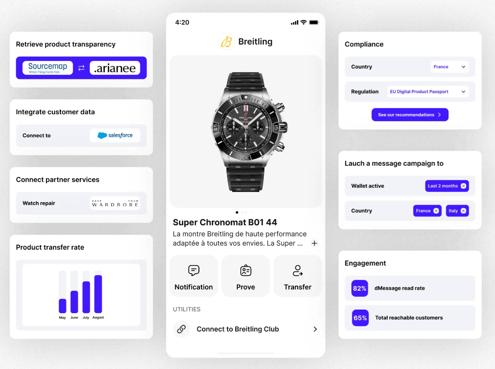 Инфраструктура Arianee позволяет таким брендам, как Breitling, выдавать цифровые паспорта часов владельцам, которые могут управлять своими данными и организовывать услуги и продукты, связанные с их активами. Источник: Arianee.
