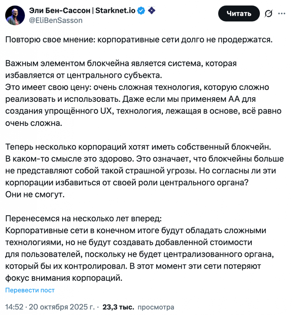 В понедельник в публикации для X Бен-Сассон заявил, что корпоративные блокчейны не выживут, поскольку они не соответствуют фундаментальной концепции технологии. Блокчейн требует избавиться от роли центрального органа.