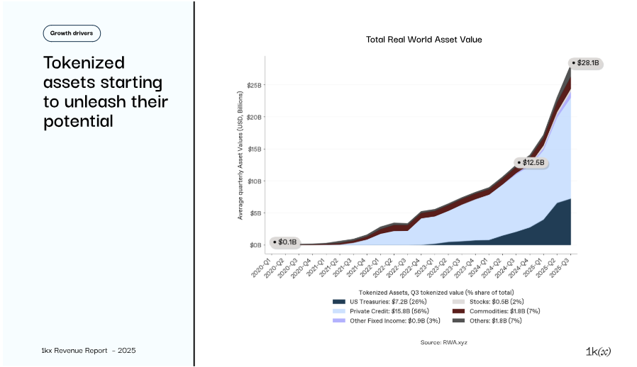 По данным 1kx, общая стоимость токенизированных активов, участвующих в блокчейне, за последний год выросла более чем в два раза, а комиссии, генерируемые этими активами, растут еще быстрее, что свидетельствует о росте пользовательской активности и принятия рынком.