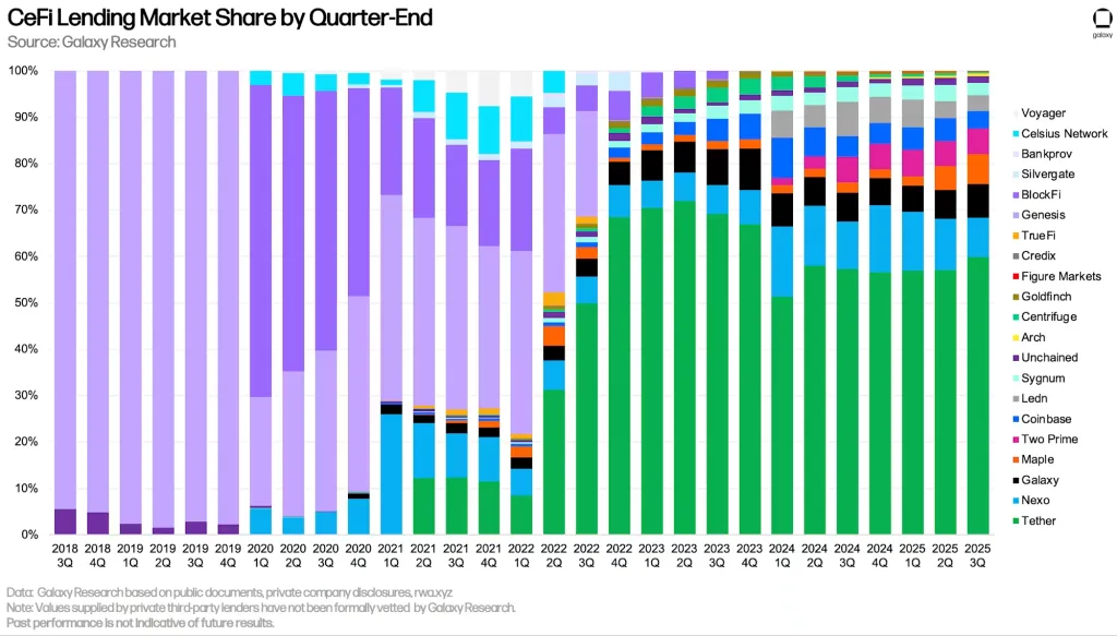 Tether остается доминирующим кредитором в CeFi, контролируя почти 60% отслеживаемых кредитов.