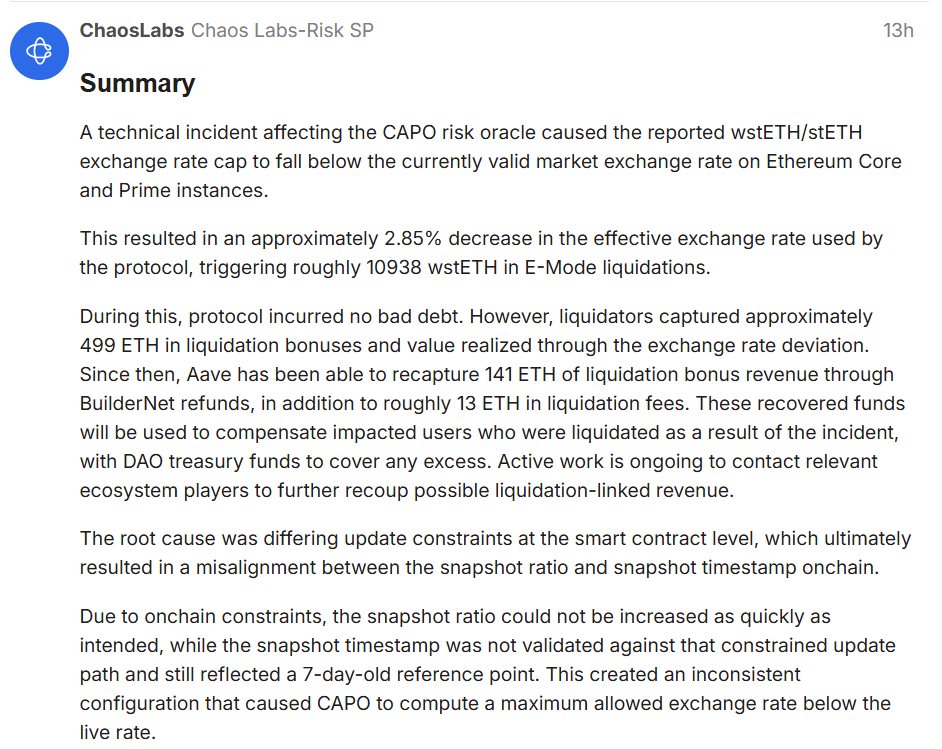 Подобное расхождение с падением обменного курса на 2,85% запустило каскад ликвидаций на ~10 938 wstETH. Сторонние ликвидаторы заработали на инциденте ~499 $ETH. Инцидент не привел к безнадежным долгам для Aave, согласно Chaos Labs.