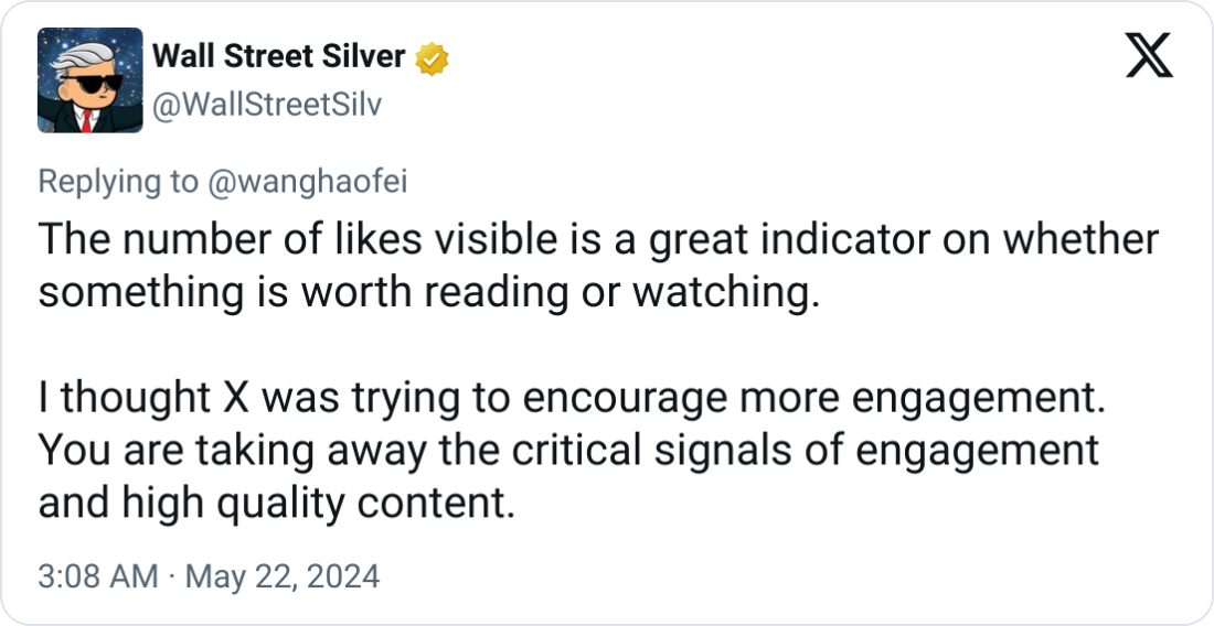 «Количество видимых лайков является отличным индикатором того, стоит ли что-то читать или смотреть, поскольку X пытался стимулировать большее участие. Вы лишаете себя важных сигналов вовлеченности и высококачественного контента», – говорится в сообщении компании.