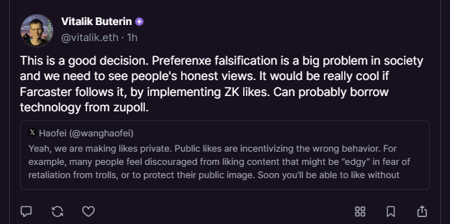 20 мая Бутерин развил эту идею дальше, предложив Farcaster внедрить лайки с нулевым разглашением (ZK) для борьбы с фальсификацией предпочтений — искажением истинных предпочтений из-за социального давления или страха.