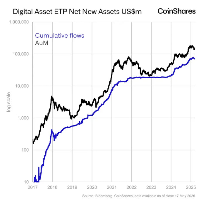 На фоне консолидации биткоина в диапазоне $102 000–$105 000 и коррекции ETH на ~3%, общий объём активов под управлением крипто-фондов достиг $172,9 млрд — близко к историческим максимумам.