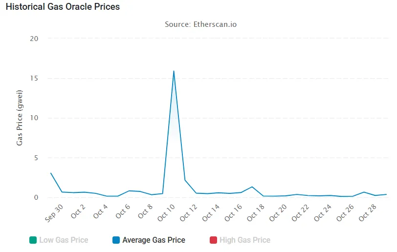 Несмотря на рост ончейн-активности, комиссии в сети Ethereum остаются вблизи исторических минимумов. 26 октября стоимость транзакции в сети составляла 0,16 gwei (около $0,01).