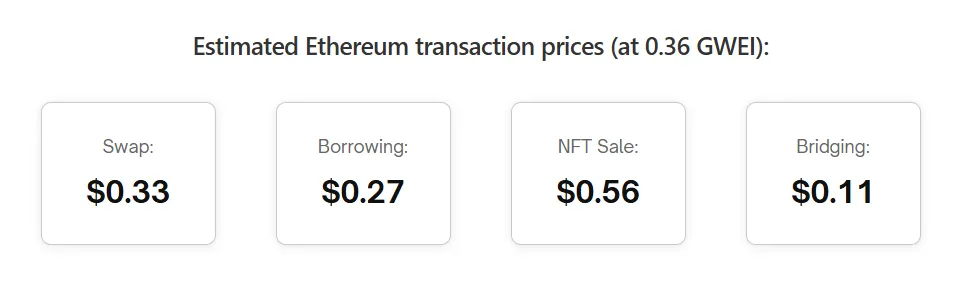 На момент написания показатель скорректировался до 0,36 gwei (около $0,02).