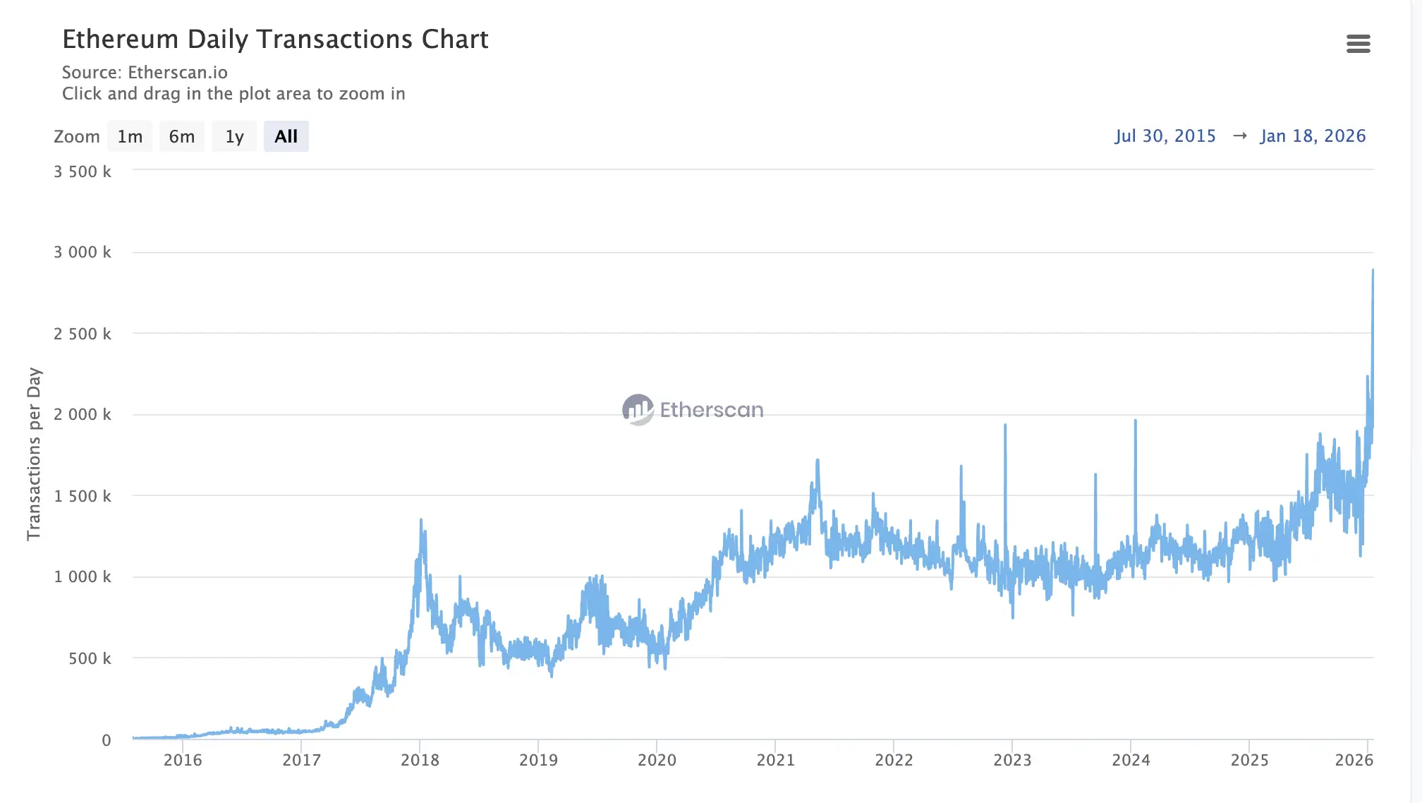В начале 2026 года наблюдался резкий подъем активности в сети: объемы транзакций достигли новых максимумов. Рост продолжился после того, как с середины декабря активность начала ускоряться, сменив постепенное замедление, которое отмечалось на протяжении большей части 2025 года.