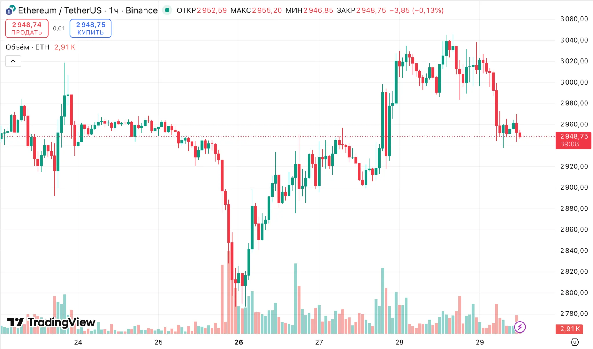 На момент написания курс ведущего альткоина составляет примерно $2940.