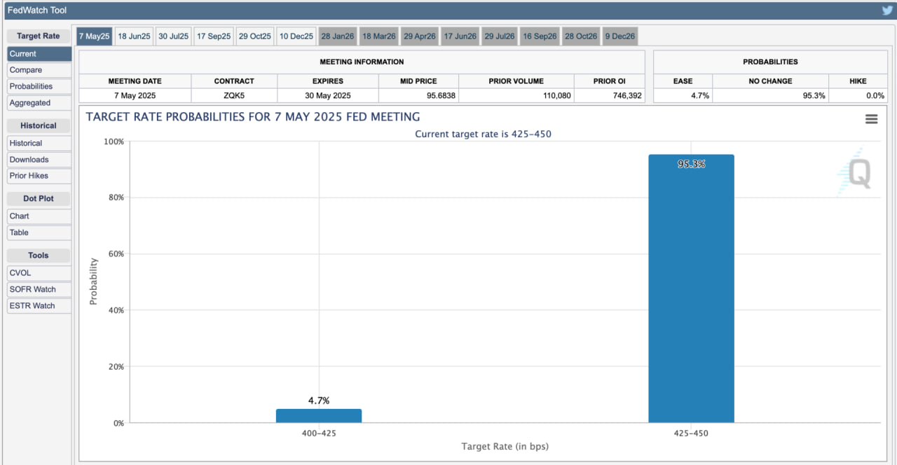 Формально на заседании 6–7 мая ФРС, вероятнее всего, не изменит ставку — 95% по CME. Но разрыв между риторикой чиновников и ожиданиями рынка становится всё более явным.