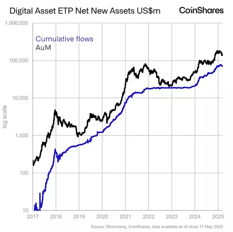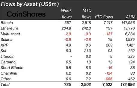 С 10 по 16 мая чистый приток в криптовалютные инвестфонды составил $785 млн против $882 млн за прошлый период. Об этом говорится в отчете CoinShares.