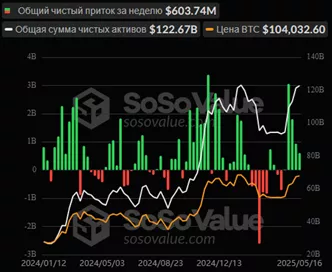 - Недельный приток в BTC-ETF замедлился с $934,2 млн до $603,7 млн.