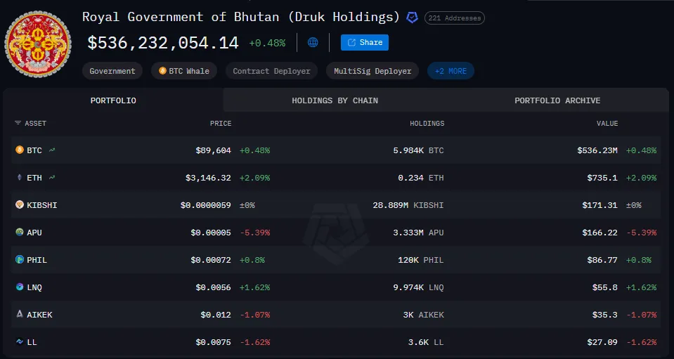 Бутан — один из первых государственных майнеров биткоина, использующий гидроэнергетику. Согласно Bitcoin Treasuries, Бутан занимает седьмое место в мире по объему резервов в цифровом золоте. На балансе страны находится 5984 BTC стоимостью более $536 млн.