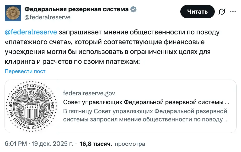 Федеральная резервная система запрашивает общественные отзывы о предлагаемом «платежном счете», который иногда называют «упрощенным мастер‑счетом». Он предоставит финтех‑компаниям и организациям, работающим с криптовалютами, ограниченный доступ к платежной инфраструктуре центрального банка — в рамках специальной системы одобрения.