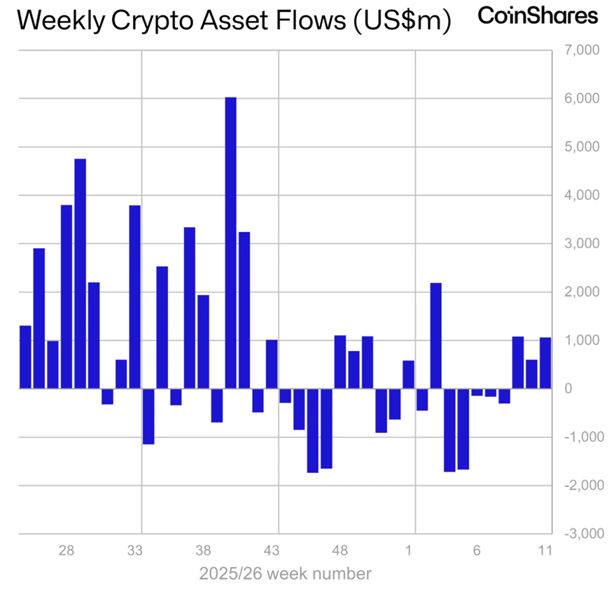 С 7 по 13 марта приток в биржевые продукты (ETP) на основе криптовалют составил $1,06 млрд против $619 млн неделей ранее. Такие данные привели в CoinShares.