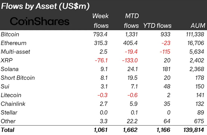 В ETP на основе Solana (SOL) инвесторы добавили $9,1 млн, на основе Sui (SUI) и Chainlink (LINK) — $3,1 млн и 2,7 млн соответственно.