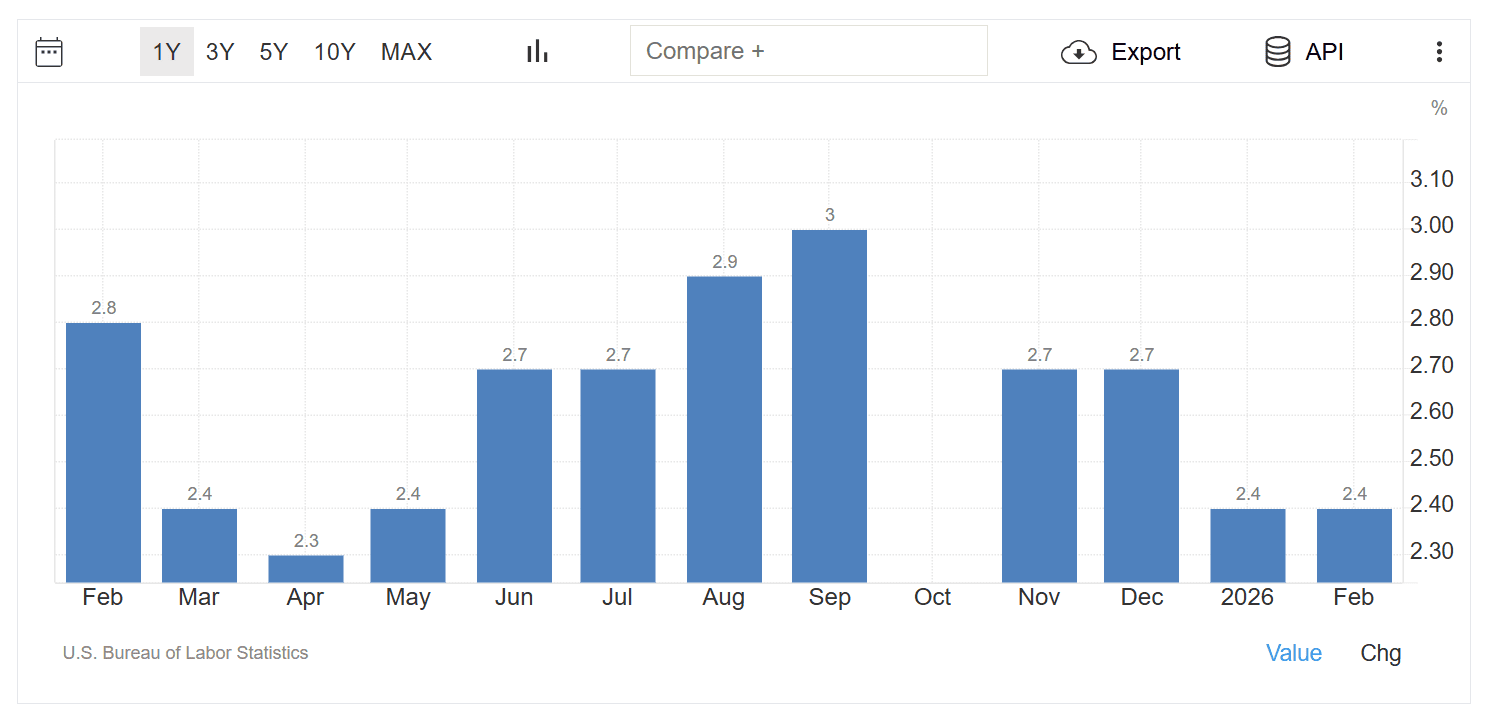 По данным Trading Economics, инфляция в США в феврале составила 2,4%, однако аналитики ожидают ее ускорение в марте 2026 года. В таких условиях ФРС, вероятно, сохранит выжидательную позицию, несмотря на политическое давление.