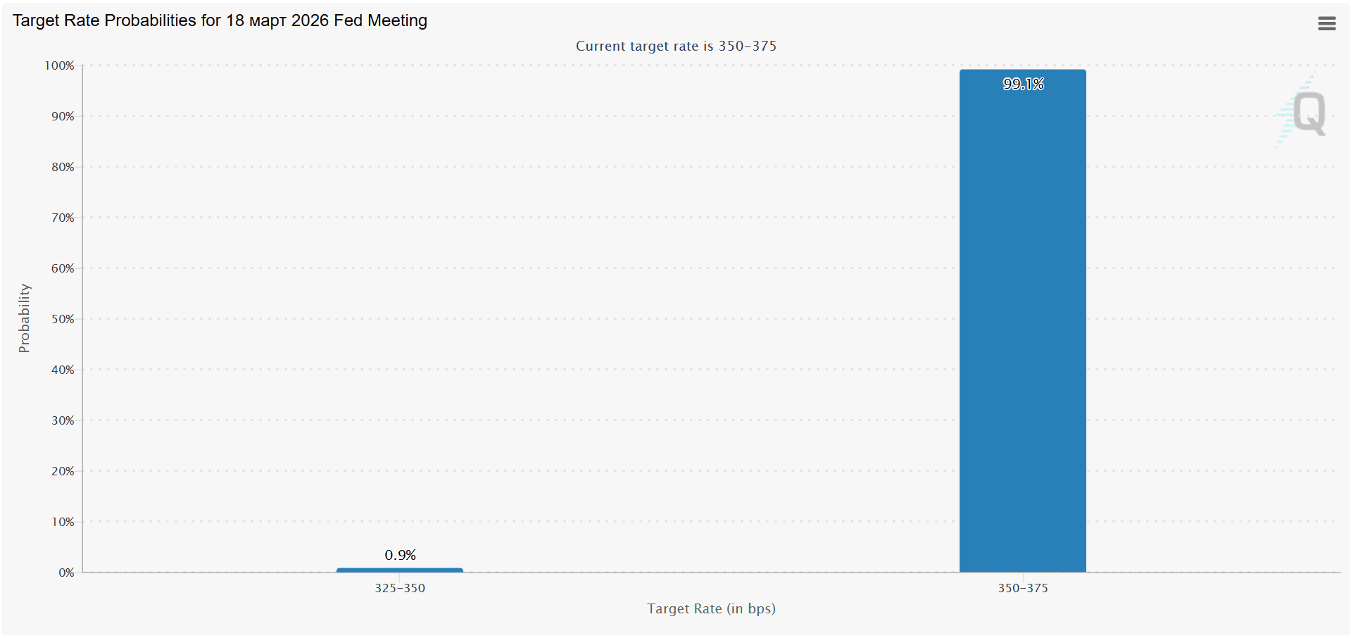 - Рынки оценивают вероятность сохранения ставки на текущем уровне почти в 99%.
