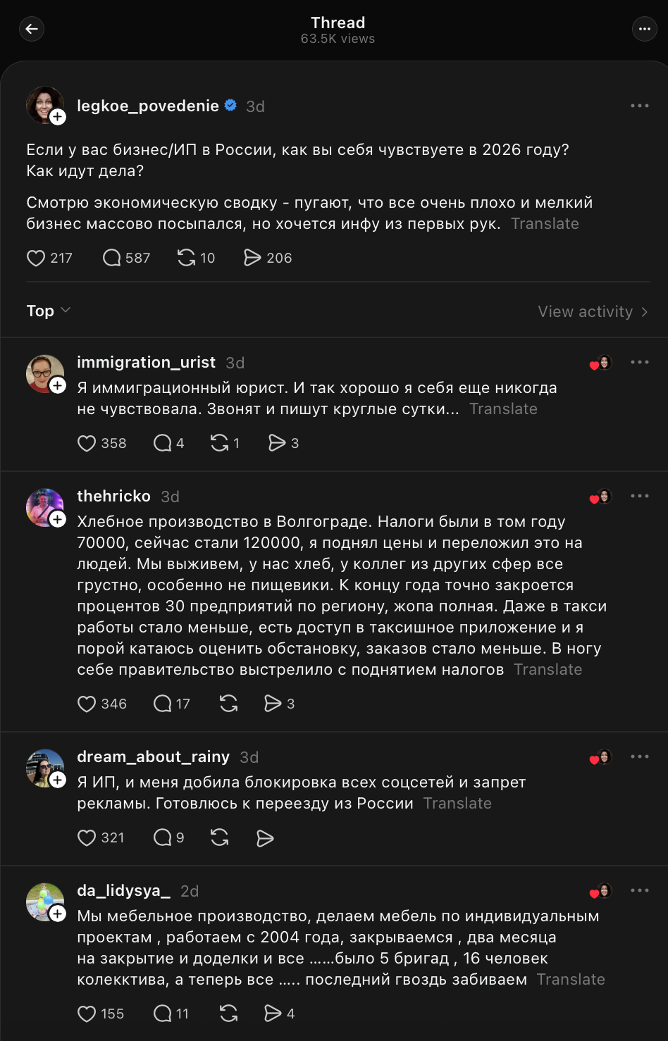 В социальной сети Threads* сотни предпринимателей со всей страны описывают одну и ту же картину. Хлебопек из Волгограда: налоги почти удвоились, поднял цены, переложил на покупателей. Мебельное производство с 2004 года, 16 человек в коллективе — закрывается. Владелец общепита: выручка упала с 300 000 рублей в январе до 20 000 в феврале и марте — такого не было даже в кризисный 2018 год. Производитель компьютеров под заказ с девятилетней историей раздал сотрудников «в добрые руки» и ликвидирует ИП. Бухгалтер, обслуживающий малый бизнес, потерял половину дохода — просто потому что клиенты сворачиваются.