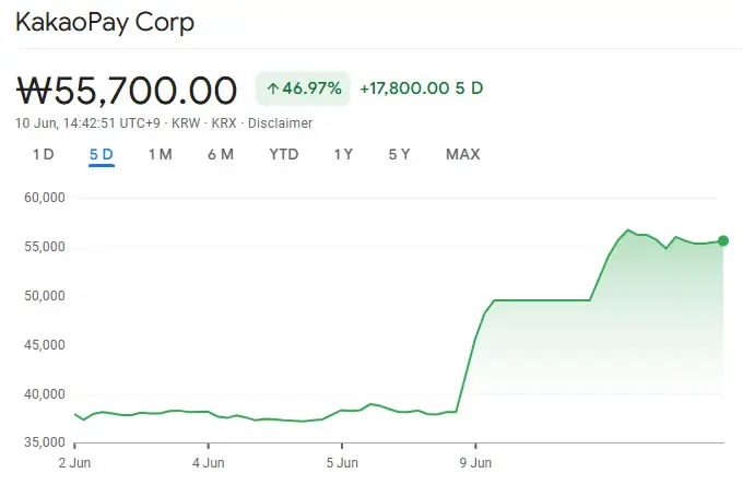 Акции KakaoPay резко выросли за последнюю неделю. Источник: Google Finance