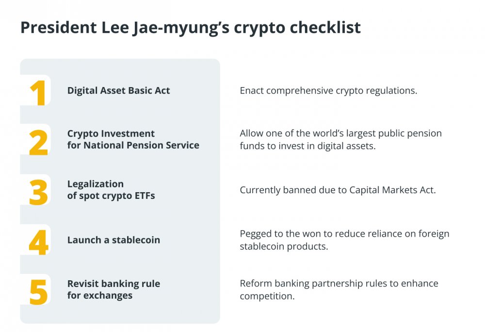 Недавно избранный президент Южной Кореи Ли Чжэ Мён ускоряет выполнение своего предвыборного обещания разрешить выпуск внутренних стейблкоинов. Его партия выступила с соответствующим криптовалютным законопроектом.