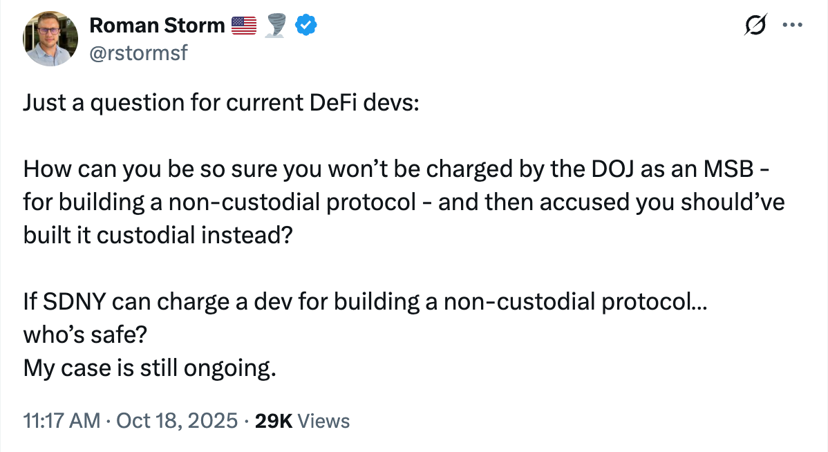В августе Роман Шторм был признан виновным по одному из 3 пунктов обвинения; присяжные признали его виновным в сговоре с целью ведения нелицензированного бизнеса по переводу денег, что создало опасный правовой прецедент для разработчиков программного обеспечения с открытым исходным кодом и вызвало шок в криптовалютном сообществе.