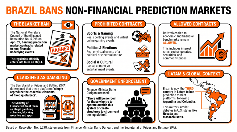 Национальный валютный совет Бразилии опубликовал постановление, вводящее полный запрет на контракты на рынках прогнозов, связанные с нефинансовыми базовыми событиями.