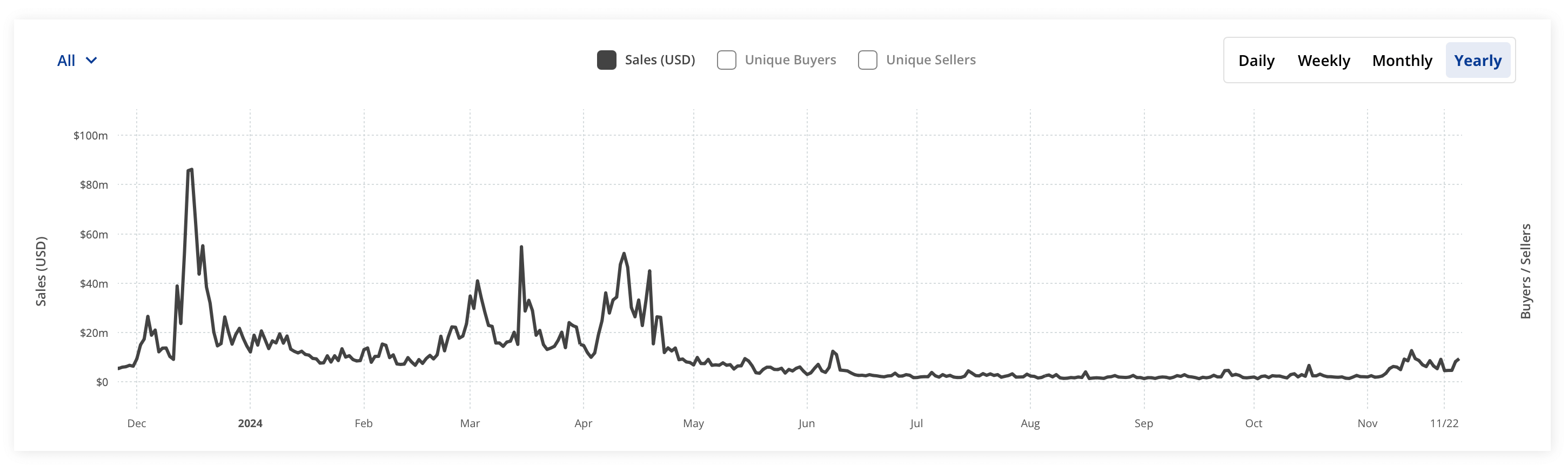 Аналогичная ситуация наблюдается в сети Биткоина, которая удивила криптосообщество успехом так называемых Ordinals. И хотя за вчера общий торговый объём с NFT в BTC составил 9 миллионов долларов, в конце 2023 года показатель был в разы больше. Это тоже заметно на графике.