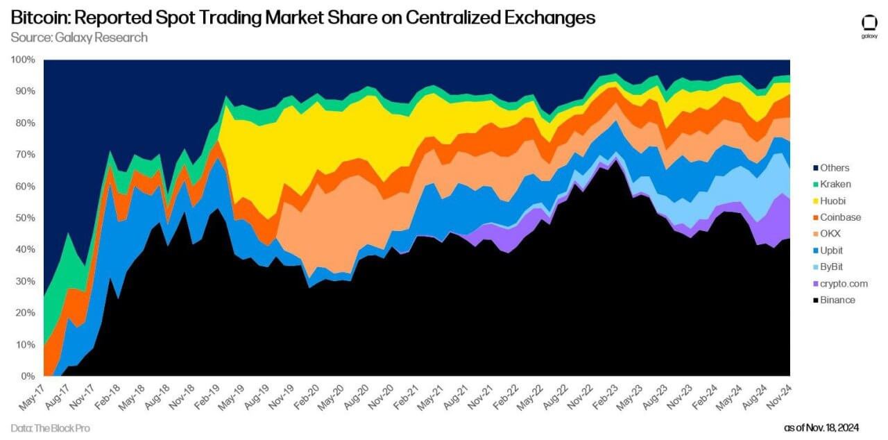 С лета 2020 года на Binance приходится не меньше 40 процентов от общих торговых объёмов с монетами на споте среди всех централизованных бирж. На графике от Galaxy Research её показатель обозначен чёрным, ну а ближайшим конкурентом для Binance в данном контексте является Crypto-com.