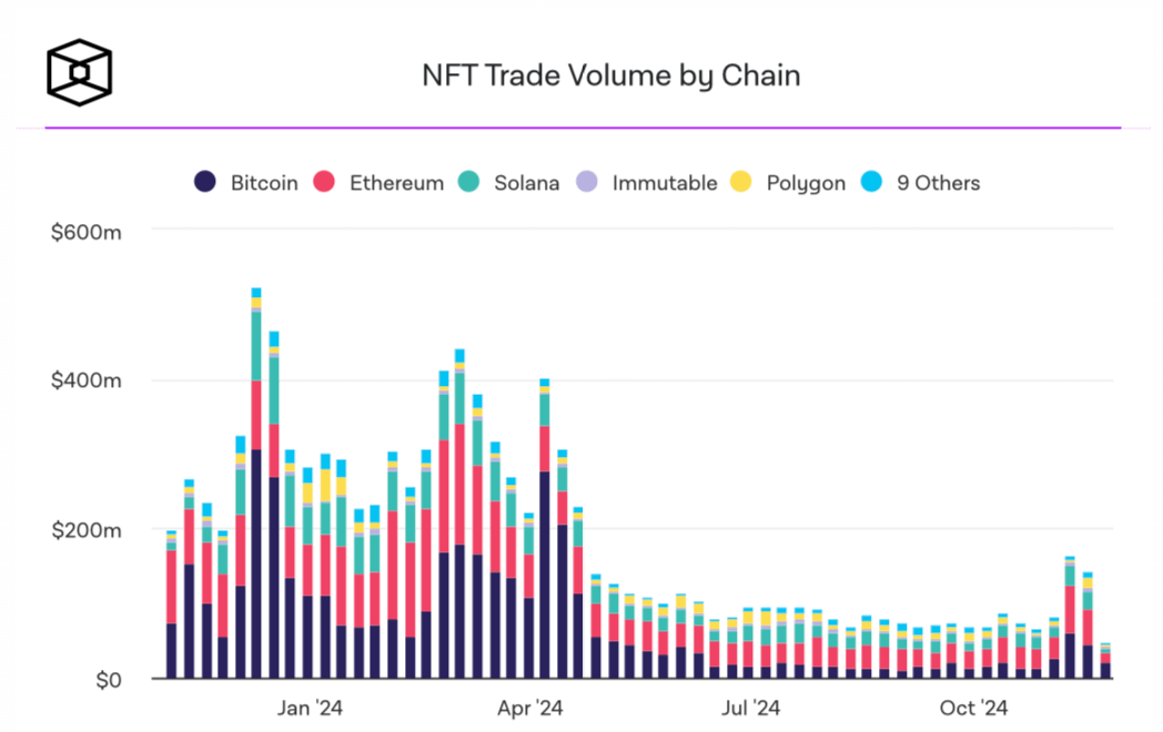 Изменение торговых объёмов с NFT в сети Биткоина за последний год