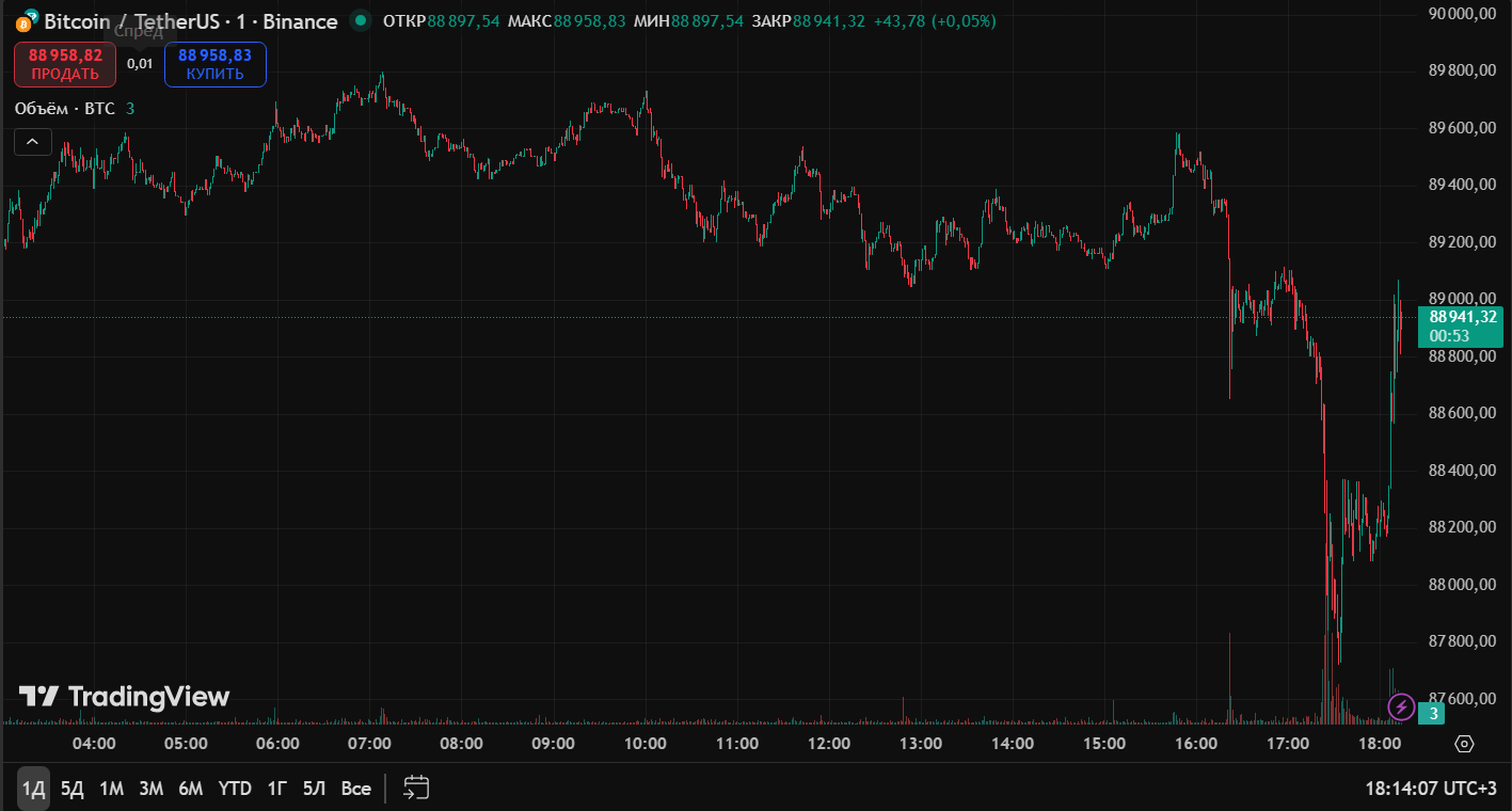 За сутки биткоин (BTC) подешевел на 1%. Он торгуется по $88 939. Актив по-прежнему держится ниже психологически значимого уровня $90 000. Внутридневной минимум криптовалюты зафиксирован на отметке $87 350.