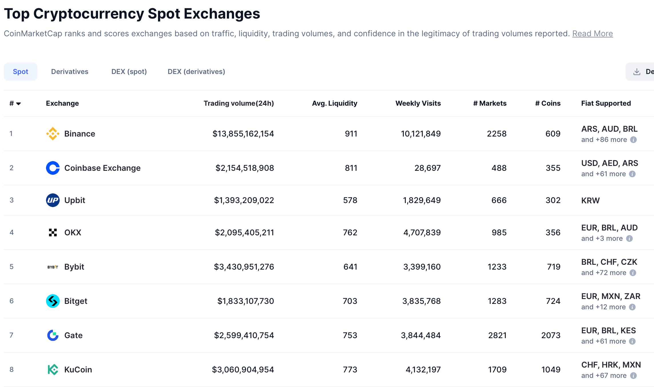 Крупнейшие криптобиржи по объему спотовой торговли. Источник: CoinMarketCap