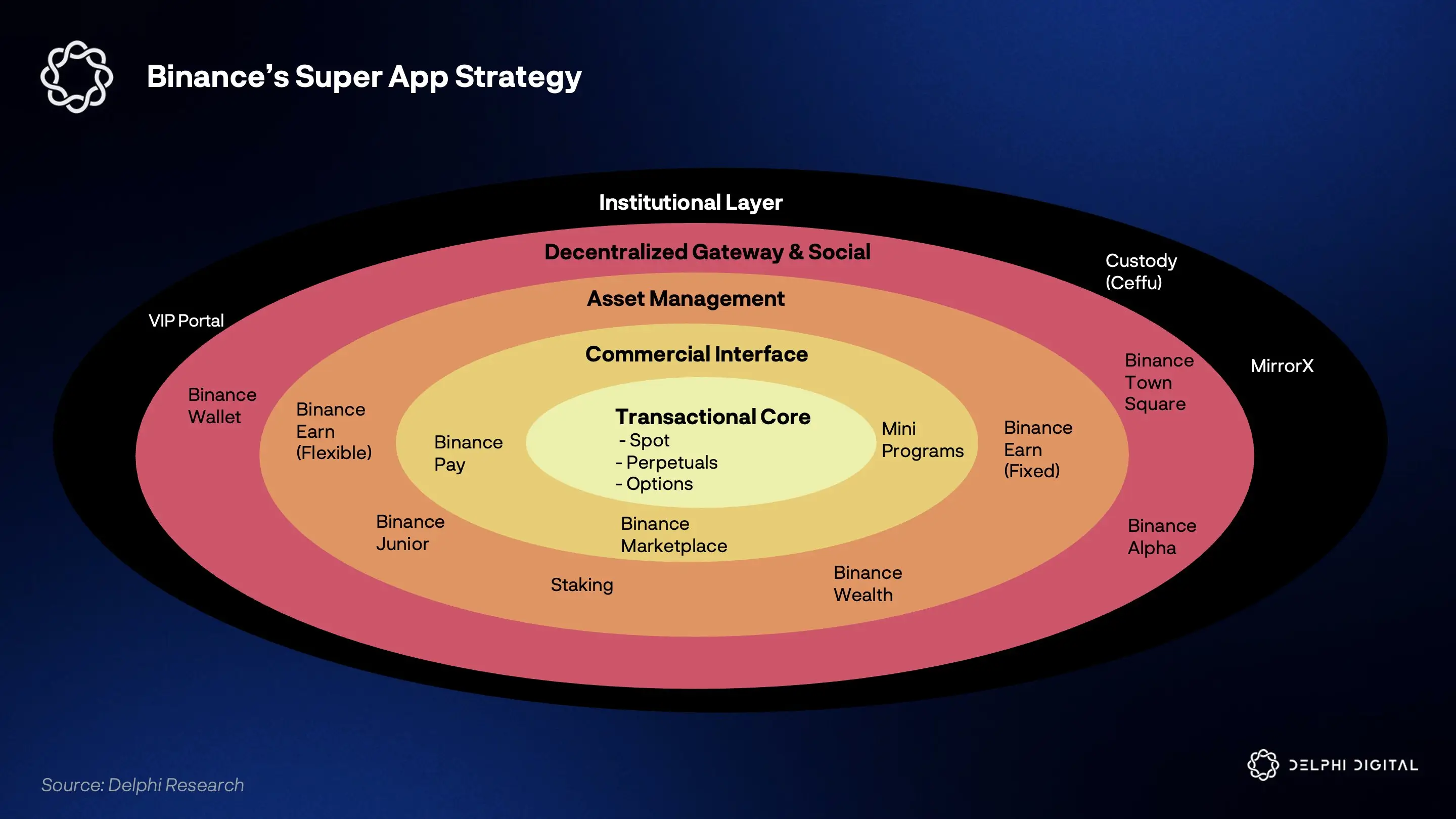 Delphi Digital называет Binance наиболее ярким примером монолитного «суперприложения». Модель биржи повторяет концепцию WeChat — «один интерфейс, бесконечная функциональность».