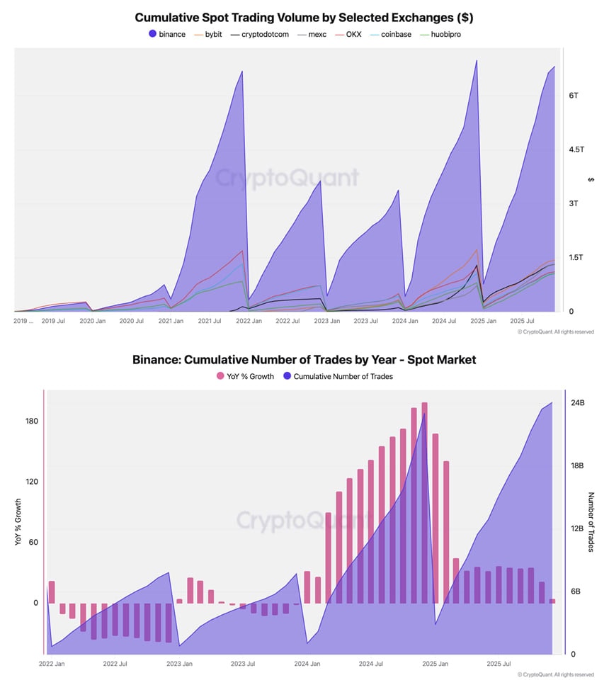 Объем спотовой торговли на Binance приближается к $7 трлн. Сейчас он составляет $6,82 трлн — это почти в 5 раз больше, чем у Bybit ($1,4 трлн). Количество сделок на спотовом достигло 24,1 млрд, что на 4% превышает рекорд 2024 года и втрое больше, чем в 2022 году.