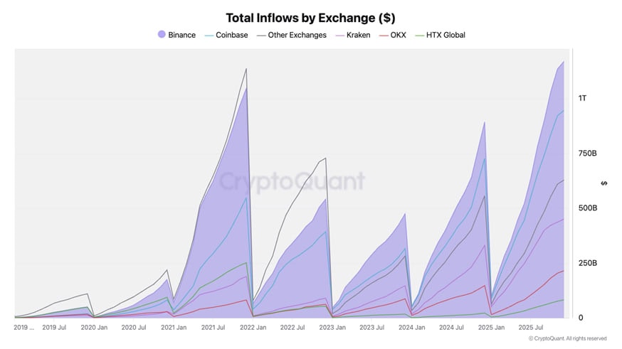 Общий объем криптоактивов, поступающих на Binance, превысил $1,17 трлн. Это на 31% больше, чем в 2024 году, и новый исторический максимум. Платформа опередила Coinbase, которая заняла второе место с $946 млрд. Об этом Incrypted сообщили представители Binance со ссылкой на данные CryptoQuant.