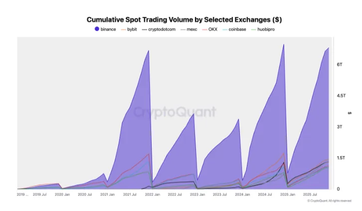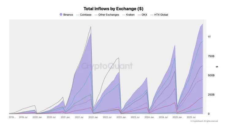 В 2025 году Binance зафиксировала приток средств в размере $1,17 трлн — рекордное значение среди криптобирж за всю историю индустрии, согласно CryptoQuant.