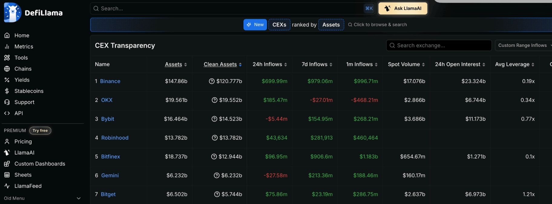 Информация по притокам/оттокам средств на крупнейших CEX. Данные: DeFiLlama.