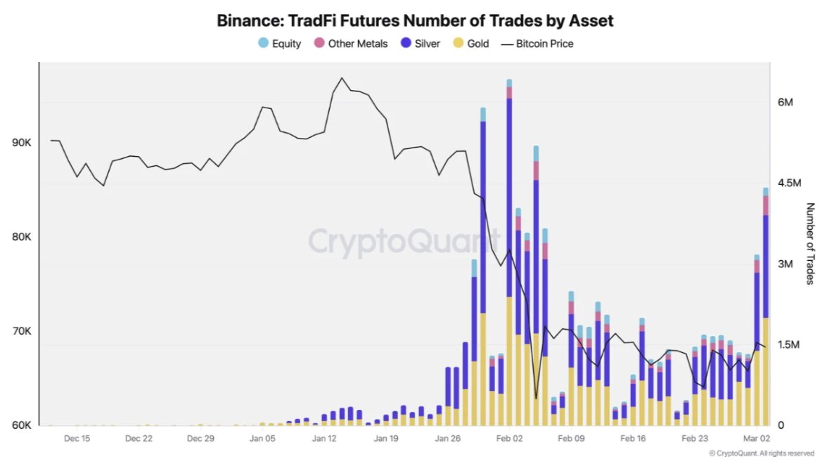 Золото обычно формирует от 25% до 65% объема TradFi перпетуальных фьючерсов на Binance. На серебро приходится остальное, местами его доля превышала 70%. Это подчеркивает доминирование драгоценных металлов в структуре торгов и концентрацию интереса трейдеров именно в этом сегменте, говорится в заявлении.