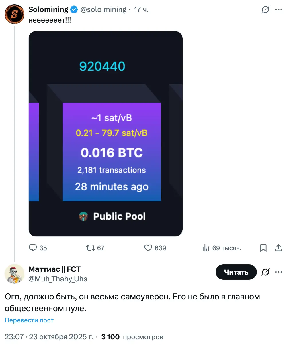 Хотя добыча блоков одиночными майнерами не является редкостью, этот случай особенно примечателен тем, что майнер обеспечил блок исключительно собственными силами, используя собственный майнинговый пул, в отличие от более распространенной практики объединения вычислительной мощности с другими участниками.