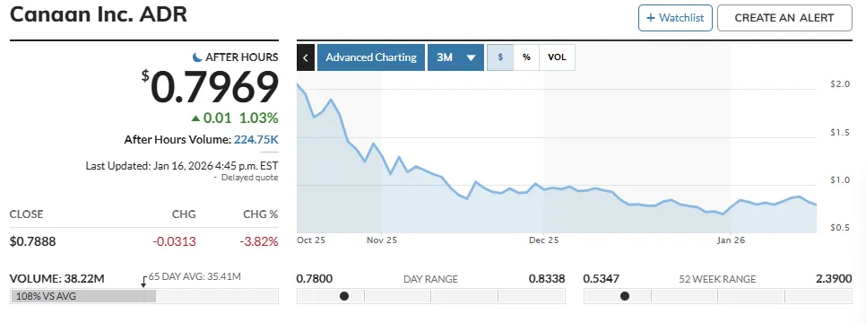 В течение последних 30 дней акции фирмы под тикером CAN торговались ниже минимального порога в $1. На момент написания котировки ценных бумаг майнера составляют около $0,79.