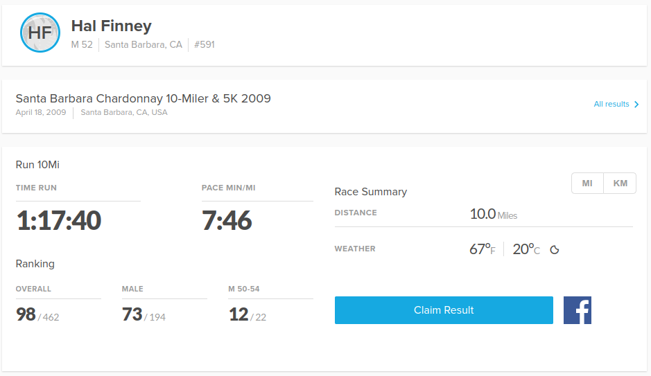 18 апреля 2009 года Хал Финни принял участие в забеге на 10 миль в Санта-Барбаре, штат Калифорния. Забег стартовал в 8 часов утра по местному времени, при этом с дистанцией Финни справился за 1 час, 17 минут и 40 секунд. Само событие было обыденным для Хала, поскольку программист занимался бегом большую часть своей жизни.