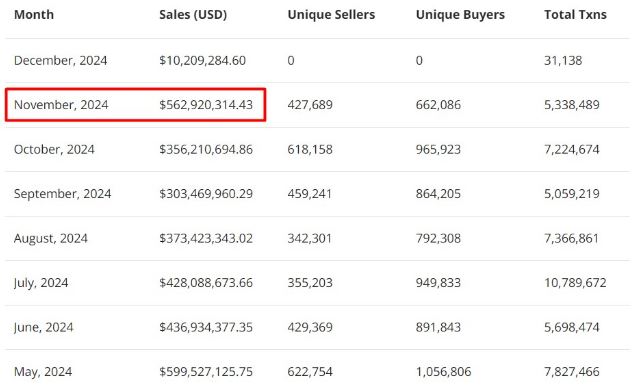 Ноябрь существенно увеличил показатель объема продаж NFT, с ростом на 57,8% по сравнению с октябрьским значением. В денежном эквиваленте это составило $562 млн, и является вторым по величине объемам с мая этого года, когда на пике своей популярности NFT привлекли $599 млн.