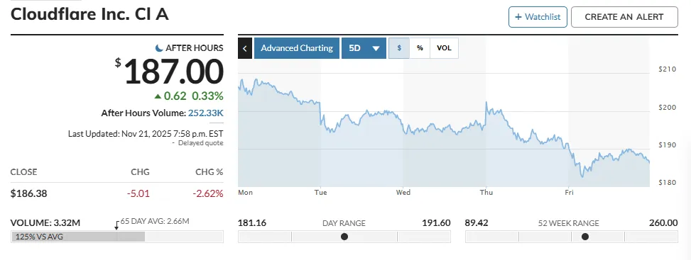 На фоне сбоя акции Cloudflare Inc (NET) упали с $208 до $187 за неделю.