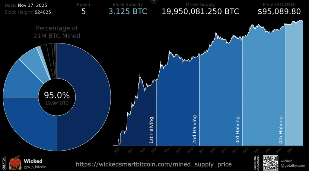 17 ноября объем добытых майнерами монет превысил 19,95 млн BTC — 95% от запрограммированного лимита в 21 млн BTC.