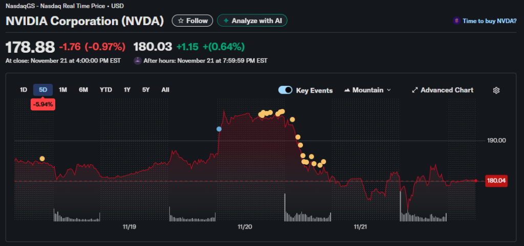 Акции самой Nvidia после публикации данных 19 ноября продемонстрировали скачок с $185 до $197. Однако к концу недели просели до $180.