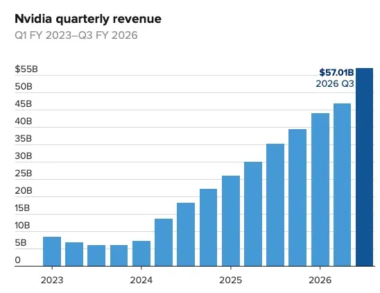 По итогам третьего квартала выручка Nvidia составила $57 млрд, что на 62% больше, чем за аналогичный период прошлого года.